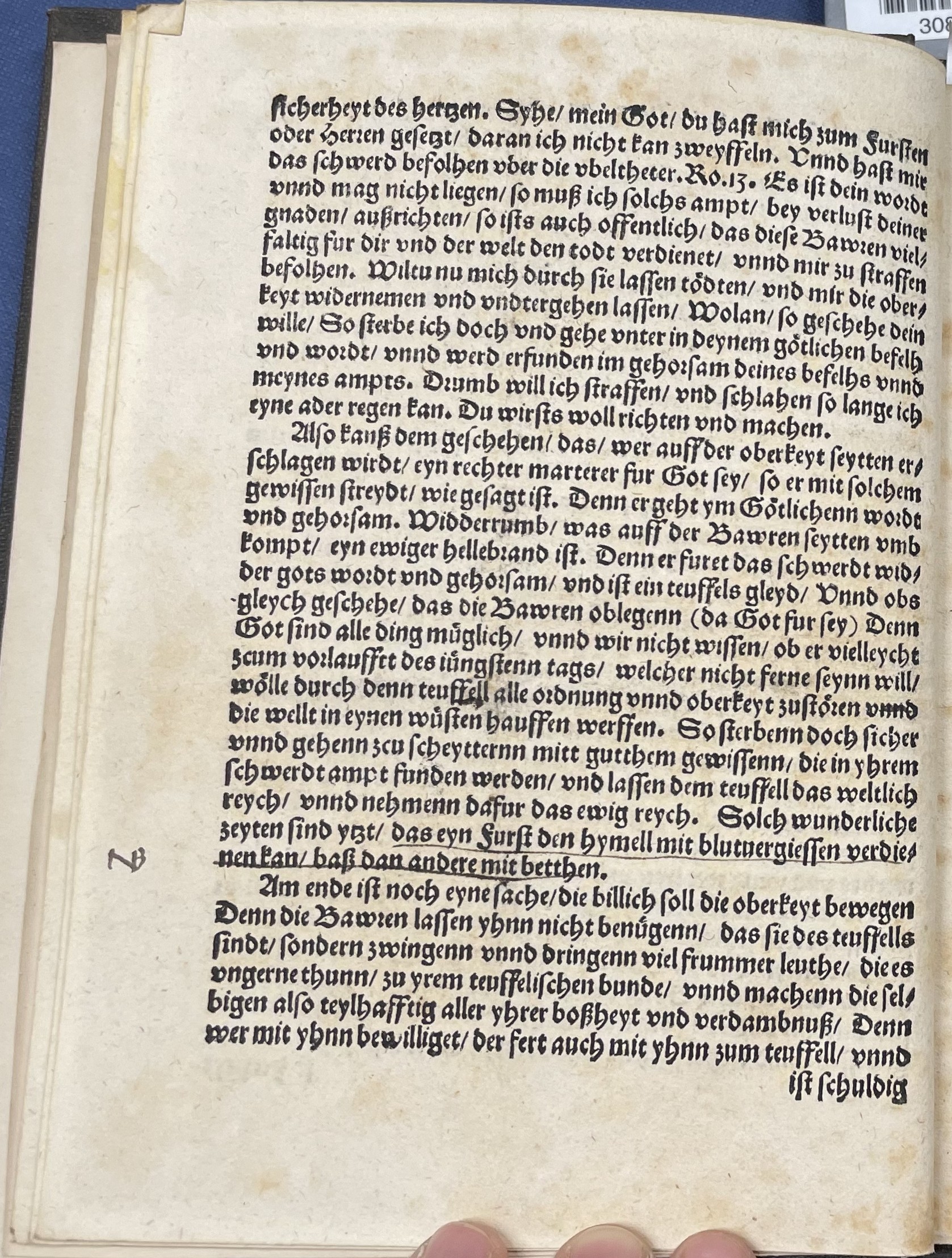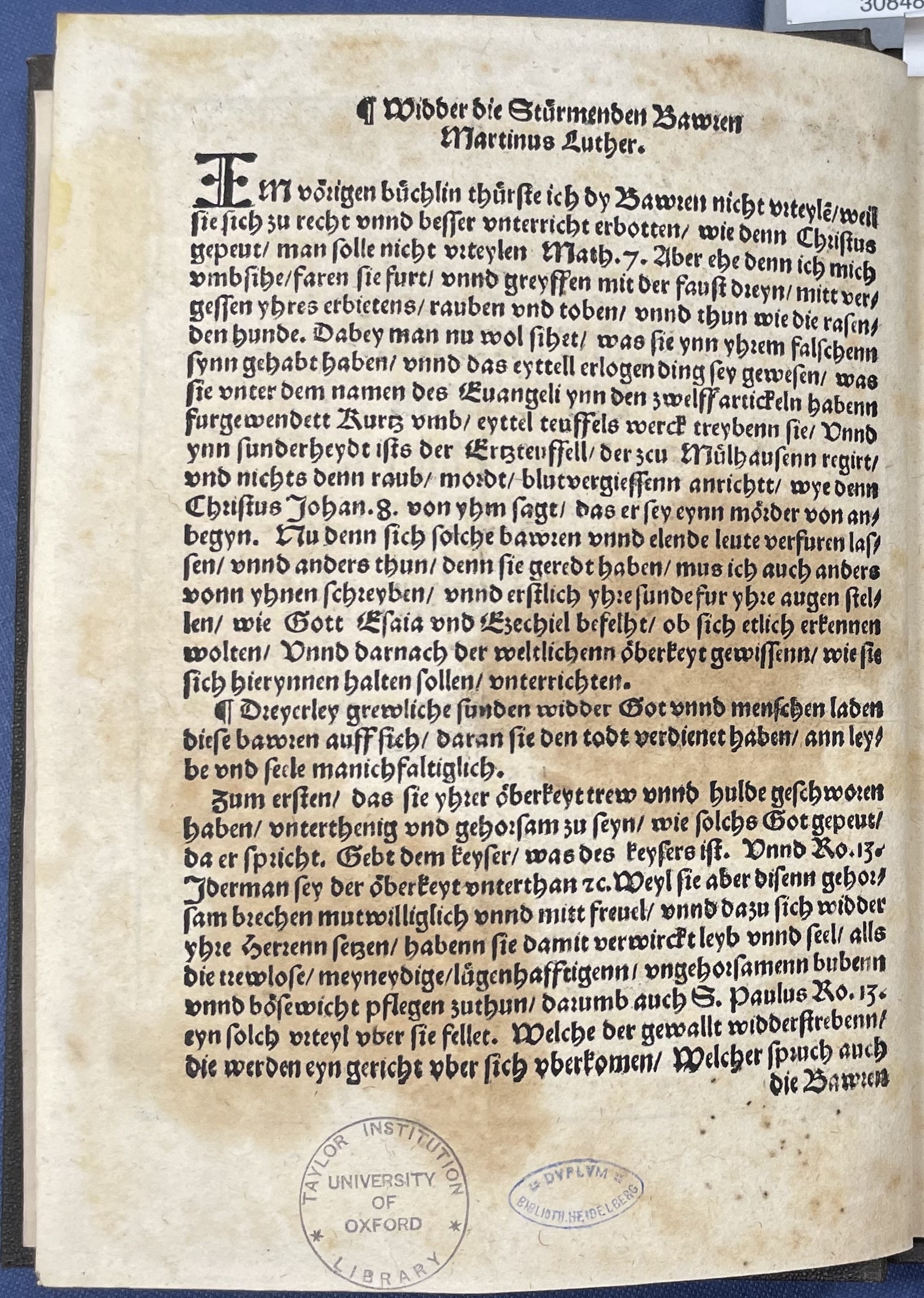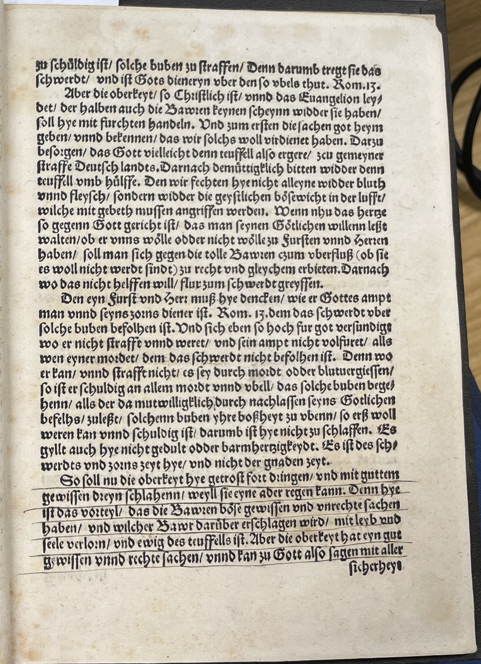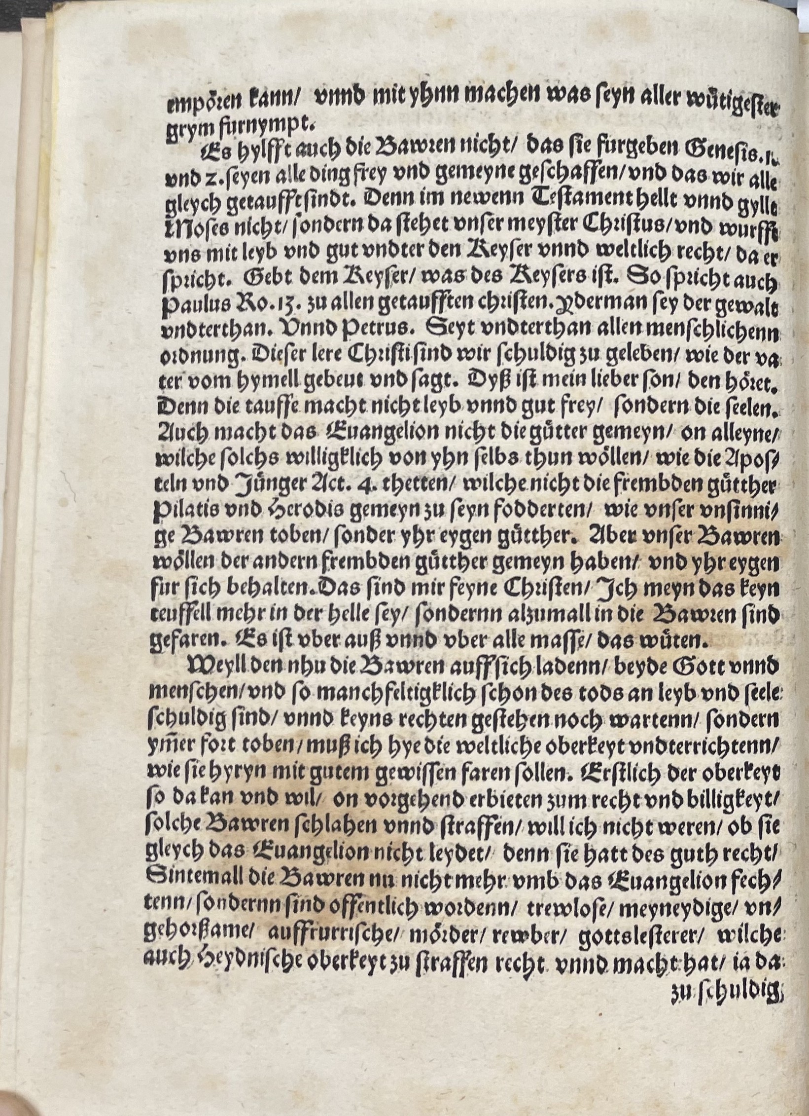 Weyll den nhu die Bawren auff sich ladenn / beyde Gott vnnd menschen / vnd so manchfeltigklich schon des tods an leyb vnd seele schuldig sind / vnnd keyns rechten gestehen noch wartenn / sondern ym̄er fort toben / muß ich hye die weltliche oberkeyt vndterrichtenn / wie sie hyryn mit gutem gewissen faren sollen. Erstlich der oberkeyt so da kan vnd will / on vorgehend erbieten zum recht und billigkeyt / solche Bawren schlahen vnnd straffen / will ich nicht weren / ob sie gleych das Euangelion nicht leydet / denn sie hatt des guth recht / Sintemall die Bawren nu nicht mehr vmb das Euangelion fechtenn sondernn sind offentlich wordenn / trewlose / meyneydige / vngehorßame auffrurrische / moͤrder / rewber / gottslesterer / wilche auch Heydnische oberkeyt zu straffen recht vnnd macht hat / ia da zu schuldig a3rzu schuͤldig ist / solche buben zu straffen / Denn darumb tregt sie das schwerdt / vnd ist Gots dieneryn vber den so vbels thut. Rom .13.