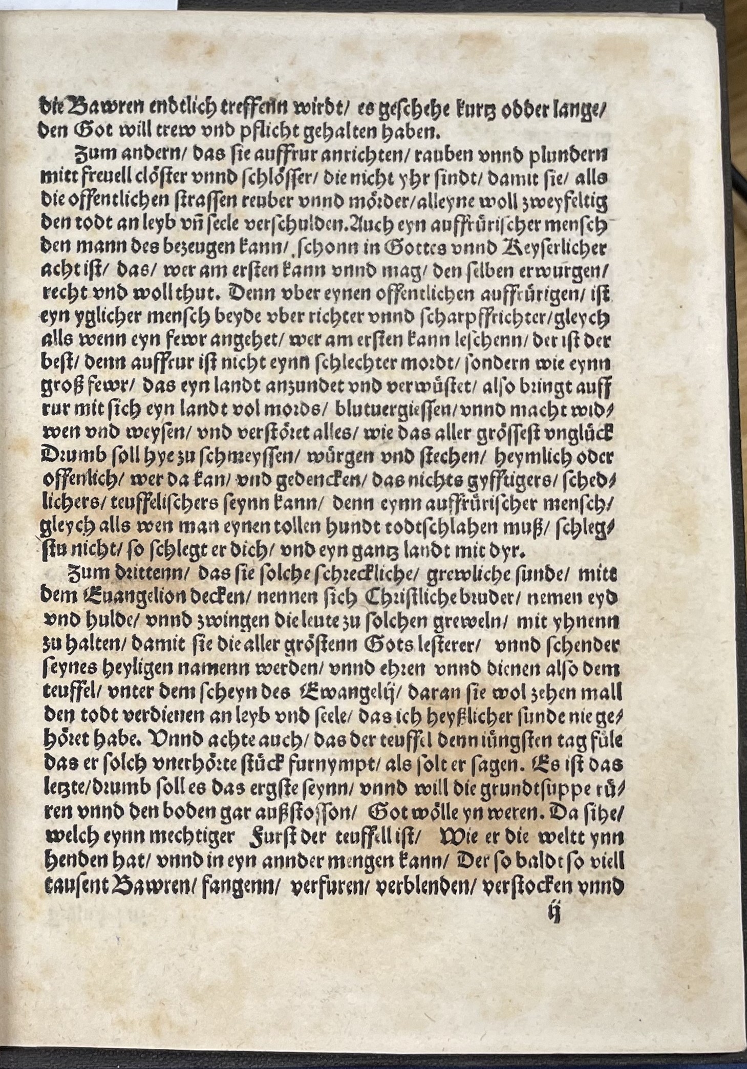 Zum andern / das sie auffrur anrichten / rauben vnnd plundern mitt freuell cloͤster vnnd schloͤsser / die nicht yhr sindt / damit sie / alls die offentlichen strassen reuber vnnd moͤrder / alleyne woll zweyfeltig den todt an leyb vn̄ seele verschulden. Auch eyn auffruͤrischer mensch den mann des bezeugen kann / schonn in Gottes vnnd Keyserlicher acht ist / das / wer am ersten kann vnnd mag / den selben erwurgen / recht vnd woll thut. Denn vber eynen offentlichen auffruͤrigen / ist eyn yglicher mensch beyde vber richter vnnd scharpffrichter / gleych alls wenn eyn fewr angehet / wer am ersten kann leschenn / der ist der best / denn auffrur ist nicht eynn schlechter mordt / sondern wie eynn groß fewr / das eyn landt anzundet vnd verwuͤstet / also bringt auffrur mit sich eyn landt vol mords / blutuergiessen / vnnd macht widwen vnd weysen / vnd verstoͤret alles / wie das aller groͤssest vngluͤck Drumb soll hie zu schmeyssen / wuͤrgen vnd stechen / heymlich oder offenlich / wer da kan / vnd gedencken / das nichts gyfftigers / schedlichers / teuffelischers seynn kann / denn eynn auffruͤrischer mensch / gleych alls wen man eynen tollen hundt todtschlahen muß / schlegstu nicht / so schlegt er dich / vnd eyn ganz landt mit dyr.