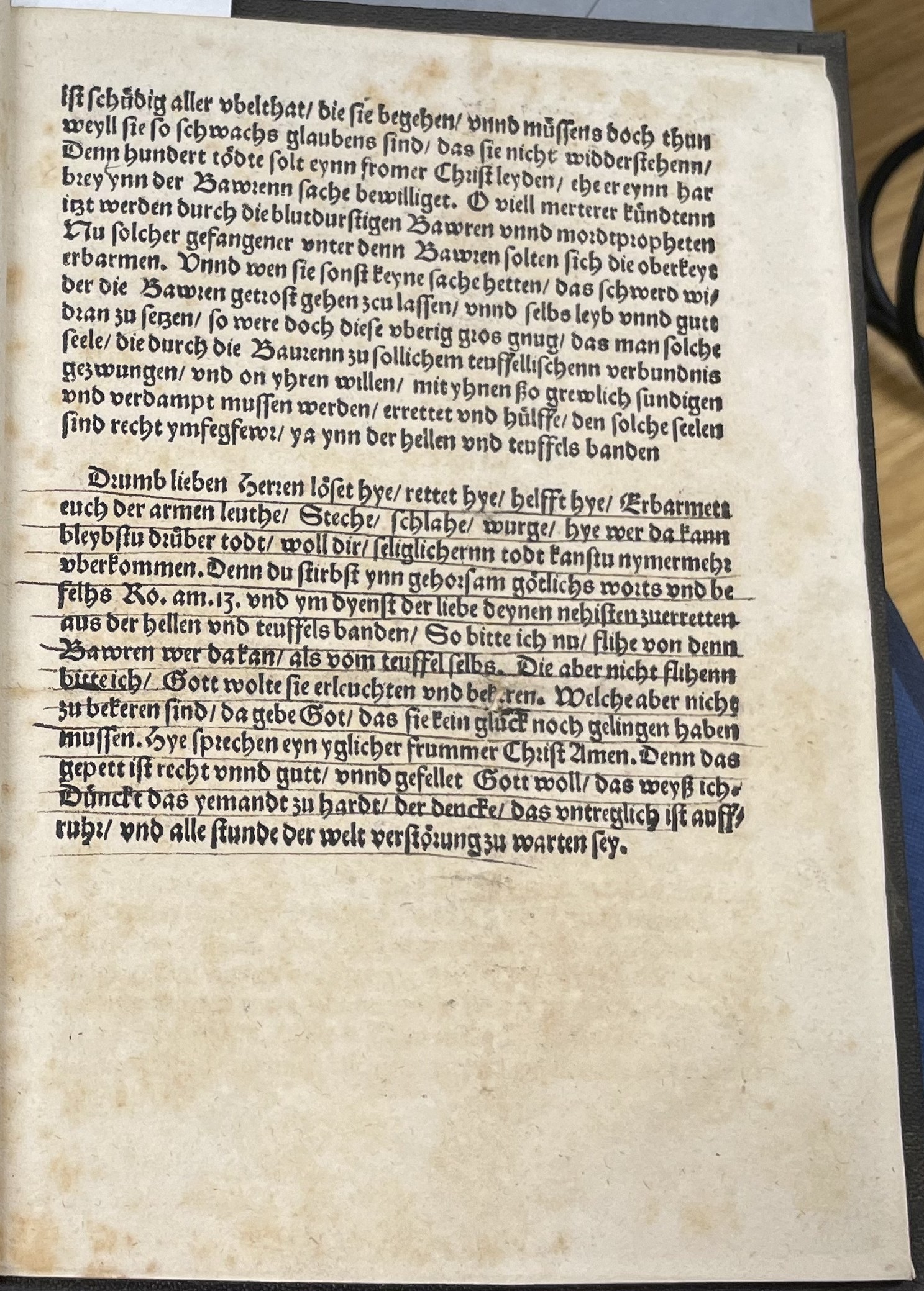 Drumb lieben Herren loͤset hye / rettet hye / helfft hye / Erbarmett euch der armen leuthe / Steche / schlahe / wurge / hye wer da kann bleybstu druͤber todt / woll dir / seliglichernn todt kanstu nymermehr vberkommen. Denn du stirbst ynn gehorsam goͤtlichs worts vnd befelhs Ro.am.13. vnd ym dyenst der liebe deynen nehisten zuerretten aus der hellen vnd teuffels banden / So bitte ich nu / flihe von denn Bawren wer da kan / als vom teuffel selbs. Die aber nicht flihenn bitte ich / Gott wolte sie erleuchten vnd bekeren. Welche aber nicht zu bekeren sind / da gebe Got / das sie kein gluck noch gelingen haben mussen. Hye sprechen eyn yglicher frummer Christ Amen. Denn das gepett ist recht vnnd gutt / vnnd gefellet Gott woll / das weyß ich. Duͤnckt das yemandt zu hardt / der dencke / das vntreglich ist auffruhr / vnd alle stunde der welt verstoͤrung zu warten sey.
