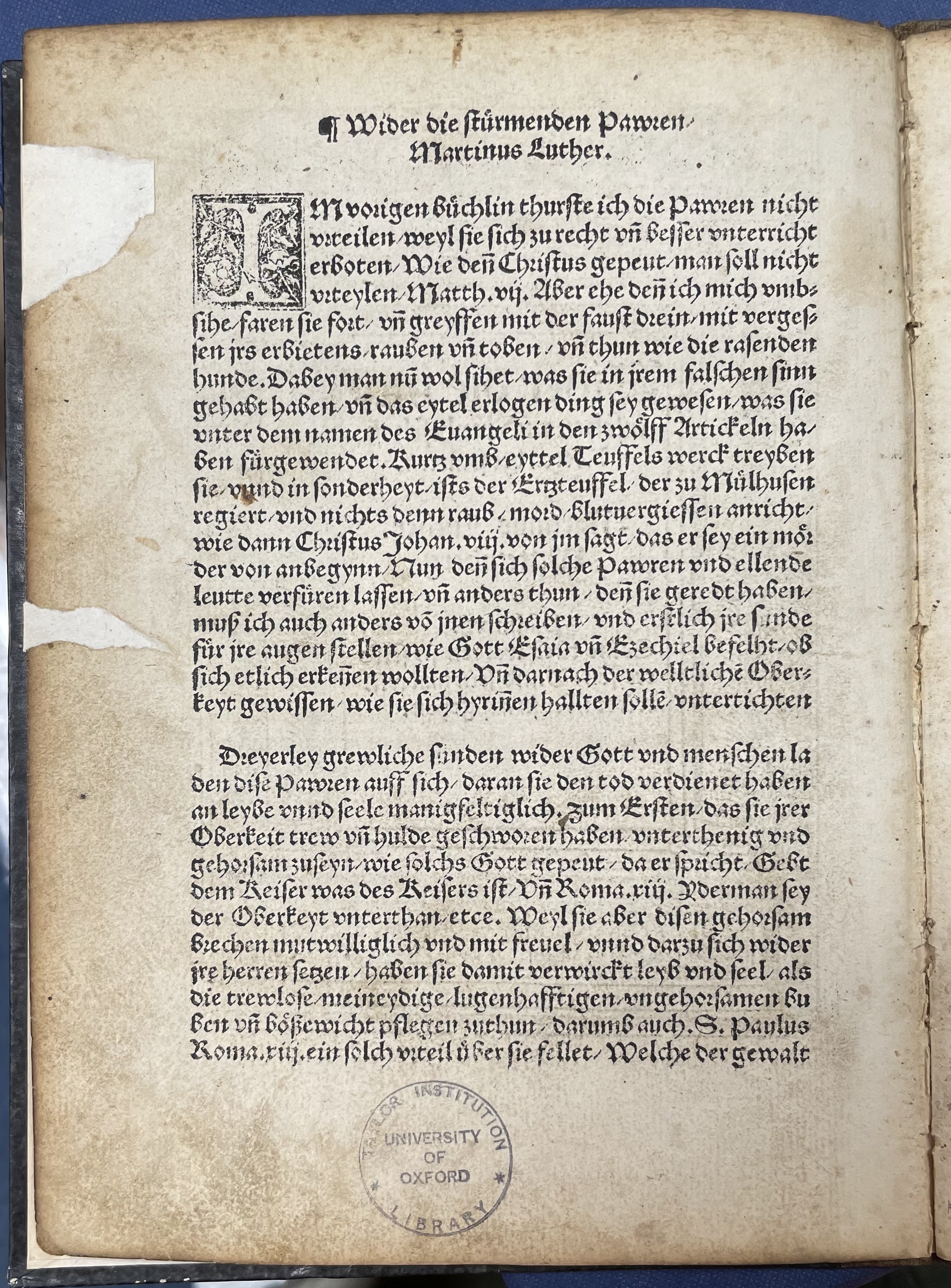 Im vorigen buͤchlin thurste** Past tense to ‘turren‘ = dare, a MHG modal verb which becomes obsolete in the 16th century, FWb s.v.‚turren‘. ich die Pawren nicht vrteilen / weyl sie sich zu recht vn̄ besser unterricht erboten** From ‚erbieten‘, to offer to do sth., see two lines below. / Wie den̄ Christus gepeut / man soll nicht vrteylen / Matth .vij. Uber ehe den̄ ich mich dann vmbsihe / faren sie fort / vn̄ greyffen mit der faust drein / mit vergessen jrs erbietens / rauben vn̄ toben / vn̄ thun wie die rasenden hunde. Dabey man nū wol sihet / was sie in jrem falschen sinn gehabt haben / vn̄ das eytel** ENHG ‚eitel‘ = completely. erlogen ding sey gewesen / was sie unter dem namen des Euangeli in den zwoͤlff Artickeln ha/ben fuͤrgewendet. Kurtz vmb / eyttel Teuffels werck treyben sie / vund in sonderheyt / ists der Erzteuffel / der zu Muͤlhusen regiert** Thomas Müntzer who was located at Mühlhausen. / vnd nichts denn raub / mord / blutuergiessen anricht / wie dann Christus Johan .viij. von jm sagt / das er sey ein moͤrder von anbegynn / Nun den̄ sich solche Pawren vnd ellende leutte verfuͤren lassen / vn̄ anders thun / den̄ sie geredt haben / muß ich auch anders vō jnen schreiben / vnd erstlich jre sunde fuͤr jre augen stellen / wie Gott Esaia vn̄ Ezechiel befelht / ob sich etlich erken̄en wollten / Vn̄ darnach der welltlichē Oberkeyt gewissen / wie sie sich hyrin̄en hallten sollē / vntertichten