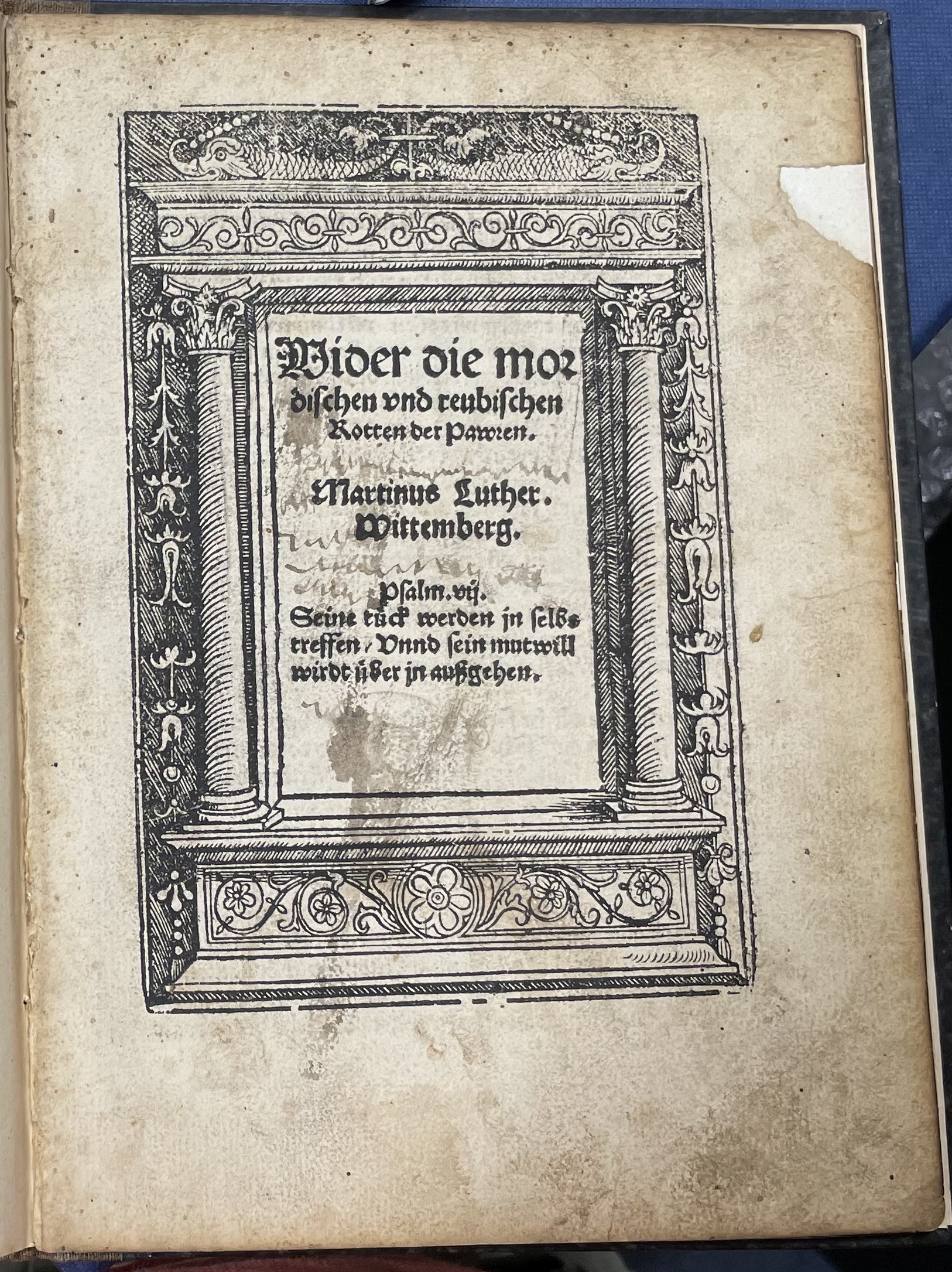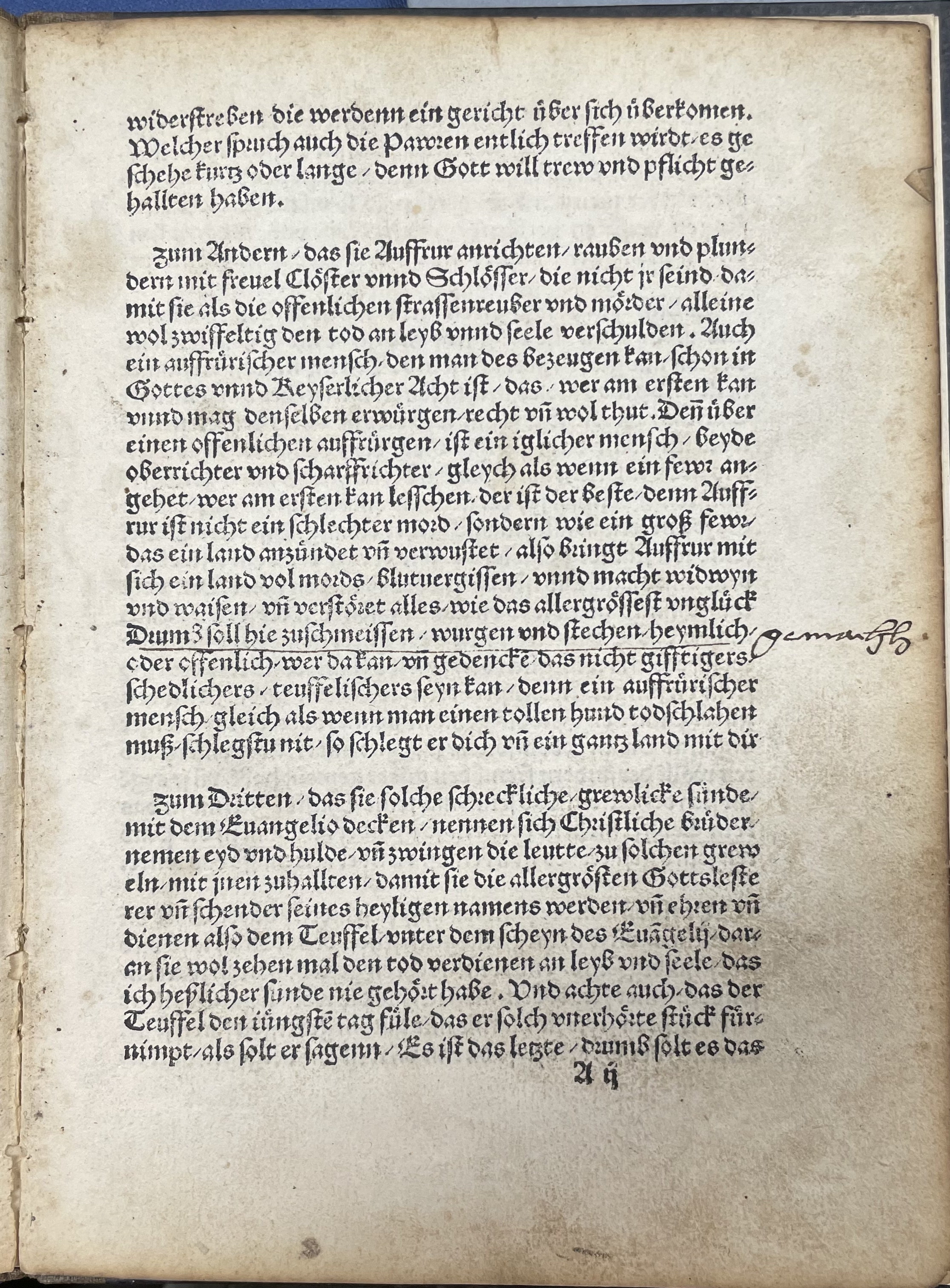 Zum Andern / das sie Auffrur anrichten / rauben vnd plundern mit freuel Cloͤster vnnd Schloͤsser / die nicht jr seind damit sie als die offenlichen strassenreuber vnd moͤrder / alleine wol zwiffeltig den tod an leyb vnnd seele verschulden. Auch ein auffruͤrischer mensch / den man des bezeugen kan / schon in Gottes vnnd Keyserlicher Acht** in der Acht sein = to be banned, cf. FWb acht2, sense2. ist / das / wer am ersten kan vnnd mag denselben erwuͤrgen / recht vn̄ wol thut. Den̄ uͤber einen offenlichen auffruͤrgen / ist ein iglicher mensch / beyde oberrichter vnd scharffrichter / gleych als wenn ein fewr angehet / wer am ersten kan lesschen / der ist der beste / denn Auffrur ist nicht ein schlechter mord / sondern wie ein gros fewr das ein land anzuͤndet vn̄ verwustet / also bringt Auffrur mit sich ein land vol mords / blutuergissen / vnnd macht widwyn vnd waisen / vn̄ verstoͤret alles / wie das allergroͤssest ungluͤck Drumb soll hie zuschmeissen / wurgen vnd stechen / heymlichgemachh /oder offenlich / wer da kan / vn̄ gedencke / das nicht gifftigers / schedlichers / teuffelischers seyn kan / denn ein auffruͤrischer mensch / gleich als wenn man einen tollen hund totschlahen muß / schlegstu nit / so schlegt er dich vn̄ ein gantz land mit dir /