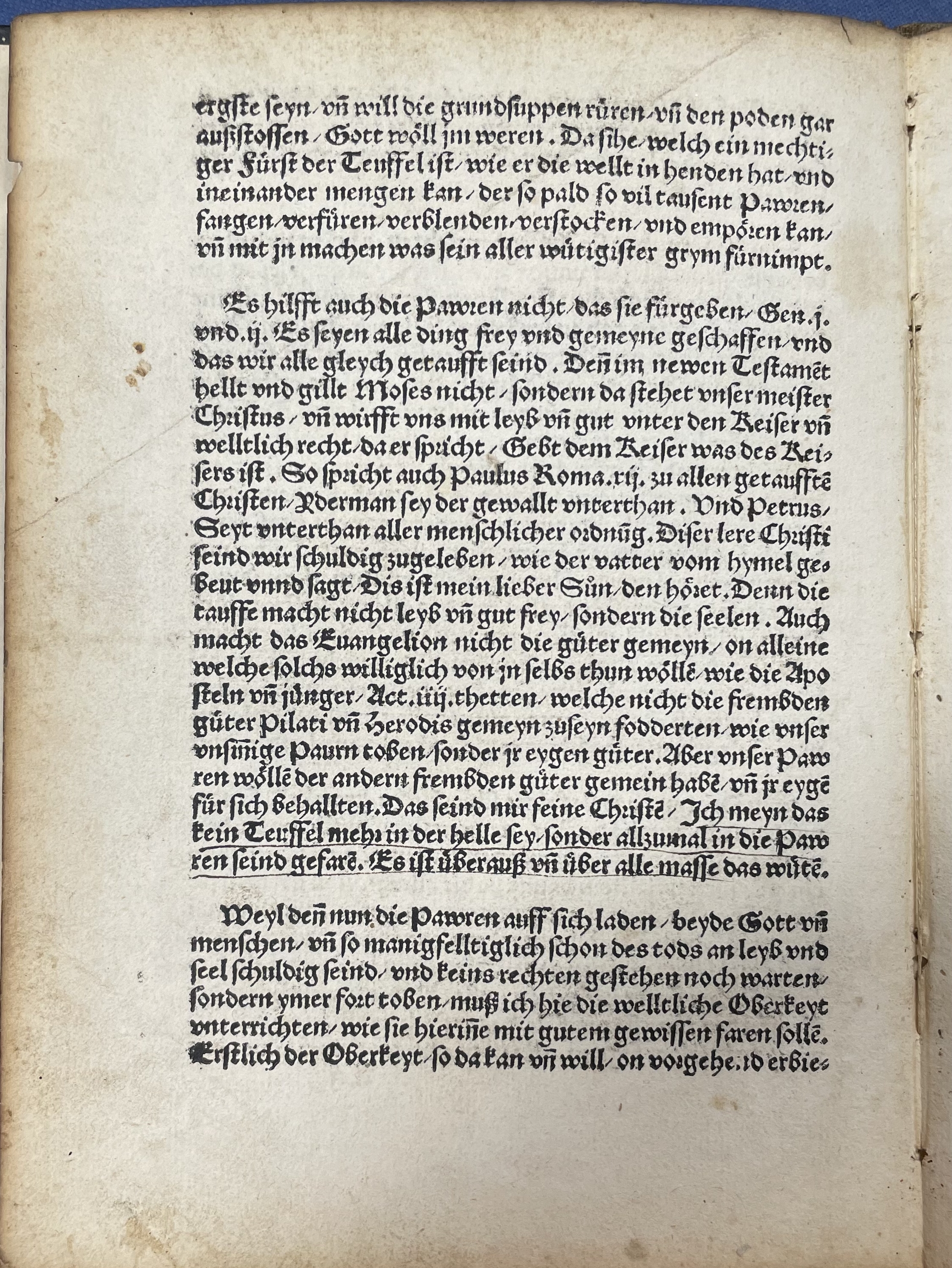 Es hillft auch die Pawren nicht / das sie fuͤrgeben / Gen.j. vnd .ij. Es seyen alle ding frey vnd gemeyne** FWb s.v. ‚gemein‘ 6 = NHG ‚allgemein‘: common, universal, shared. geschaffen / vnd das wir alle gleych getaufft seind. Den̄ im newen Testamēt hellt vnd gillt** = NHG ‚hält und gilt‘, legal formula for something that will last and be legally binding. Moses nicht / sondern da stehet vnser meister Christus / vn̄ wirfft vns mit leyb vn̄ gut vnter den Keiser vn̄ welltlich recht / da er spricht / Gebt dem Keiser was das Keisers ist. So spricht auch Paulus Roma.xij. zu allen getaufftē Christen / Yderman sey der gewallt vnterthan. Vnd Petrus / Seyt vnterthan aller menschlicher ordnūg. Diser lere Christi seind wir schuldig zugeleben / wie der vatter vom hymel gebeut vnnd sagt / Dis ist mein lieber Suͦn / den hoͤret. Denn die tauffe macht nicht leyb vn̄ gut frey / sondern die seelen. Auch macht das Euangelion nicht die guͤter gemeyn / on alleine welche solchs williglich von jn selbs thun woͤllē / wie die Aposteln vn̄ juͤnger / Act.iiij. thetten / welche nicht die frembden guͤter Pilati vn̄ Herodis gemeyn zuseyn fodderten / wie vnser vnsin̄ige Paurn toben / sonder jr eygen guͤter. Aber vnser Pawren woͤllē der andern frembden guͤter gemein habē / vn̄ jr eygē fuͤr sich behallten. Das seind mir feine Christē / Ich meyn das kein Teuffel mehr in der helle sey / sonder allzumal in die Pawren seind gefarē. Es ist uͤberauß vn̄ uͤber alle masse das wuͤtē.
