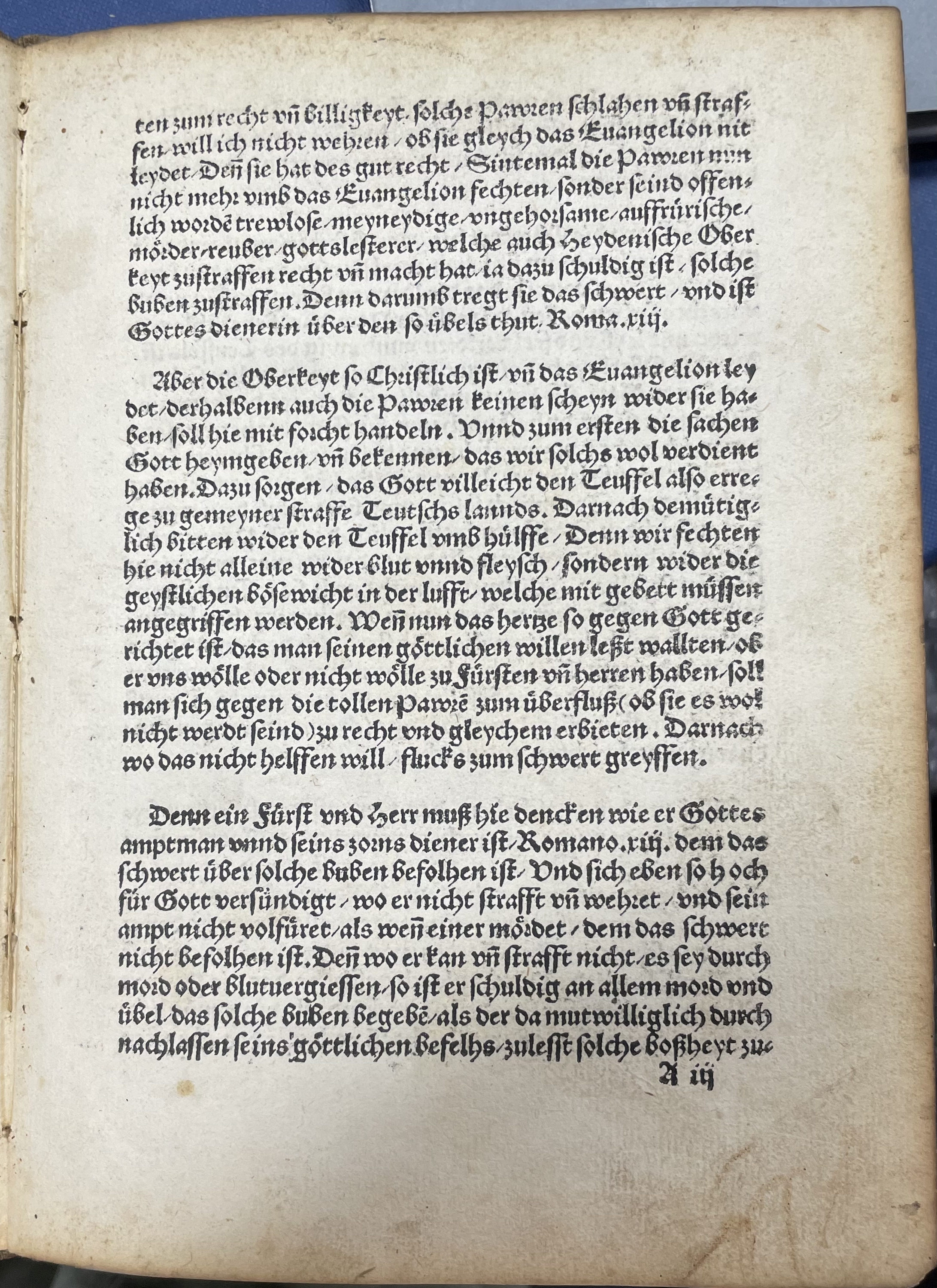 Denn ein Fuͤrst vnd Herr muß hie dencken wie er Gottes amptman vnnd seins zorns diener ist / Romano .xiij. dem das schwert uͤber solche buben befolhen ist / Vnd sich eben so hoch fuͤr Gott versuͤndigt / wo er nicht strafft vn̄ wehret / und sein ampt nicht volfuͤret / als wen̄ einer moͤrdet / dem das schwert nicht befolhen ist. Den̄ wo er kan vn̄ strafft nicht / es sey durch mord oder blutuergiessen / so ist er schuldig an allem mord vnd uͤbel / das solche buben begebē / als der da mutwilliglich durch nachlassen seins goͤttlichen befelhs / zulesst solche boßheyt zu
