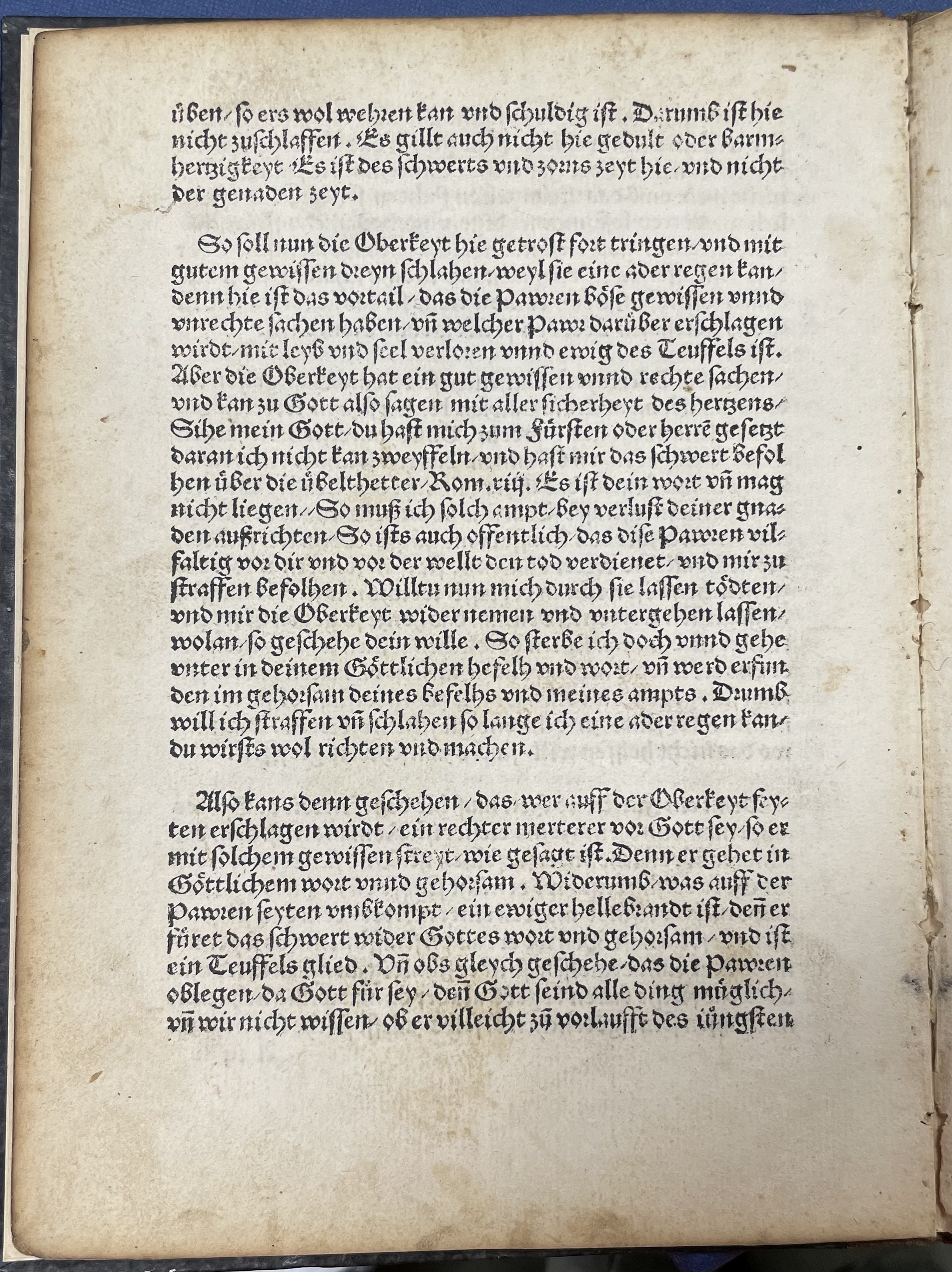 So soll nun die Oberkeyt hie getrost fort tringen / vnd mit gutem gewissen dreyn schlahen / weyl sie eine ader regen kan / denn hie ist das vortail / das die Pawren boͤse gewissen vnnd unrechte sachen haben / vn̄ welcher Pawr daruͤber erschlagen wirdt / mit leyb vnd seel verloren vnnd ewig des Teuffels ist. Aber die Oberkeyt hat ein gut gewissen vnnd rechte sachen / vnd kan zu Gott also sagen mit aller sicherheyt des hertzens / Sihe mein Gott / du hast mich zum Fuͤrsten oder herrē gesetzt daran ich nicht kan zweyffeln / vnd hast mir das schwert befolhen uͤber die uͤbelthetter / Rom .xiij. Es ist dein wort vn̄ mag nicht liegen // So muß ich solch ampt / bey verlust deiner gnaden außrichten / So ists auch offentlich / das dise Pawren vilfaltig vor dir vnd vor der wellt den tod verdienet / vnd mir zu straffen befolhen. Willtu nun mich durch sie lassen toͤdten / vnd mir die Oberkeyt wider nemen vnd vntergehen lassen / wolan / so geschehe dein wille. So sterbe ich doch vnnd gehe vnter in deinem Goͤttlichen befelh vnd wort / vn̄ werd erfintden im gehorsam deines befelhs vnd meines ampts. Drumb will ich straffen vn̄ schlahen so lange ich eine ader regen kan / du wirsts wol richten vnd machen.