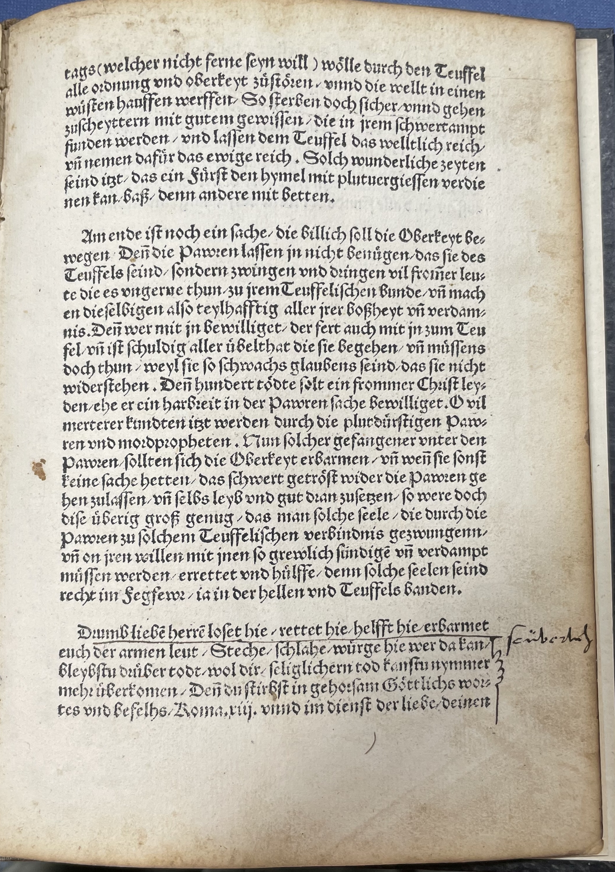 Am ende ist noch ein sache / die billich soll die Oberkeyt bewegen / Den̄ die Pawren lassen jn nicht benuͤgen / das sie des Teuffels seind / sondern zwingen vnd dringen vil from̅er leute die es vngerne thun / zu jrem Teuffelischen bunde / vn̄ machen dieselbigen also teylhafftig aller jrer boßheyt vn̄ verdamnis. Den̄ wer mit jn bewilliget / der fert auch mit jn zum Teufel / vn̄ ist schuldig aller uͤbelthat die sie begehen / vn̄ muͤssens doch thun / weyl sie so schwachs glaubens seind / das sie nicht widerstehen. Den̄ hundert toͤdte solt ein frommer Christ leyden / ehe er ein harbreit** literally: a hair’s breadth. in der Pawren sache bewilliget. O vil merterer kundten itzt werden durch die plutduͤrstigen Pawren vnd mordpropheten. Nun solcher gefangener vnter den Pawren / sollten sich die Oberkeyt erbarmen / vn̄ wen̄ sie sonst keine sache hetten / das schwert getroͤst wider die Pawren gehen zulassen / vn̄ selbs leyb vnd gut dran zusetzen / so were doch dise uͤberig groß genug / das man solche seele / die durch die Pawren zu solchem Teuffelichen verbindnis gezwungenn / vn̄ on jren willen mit jnen so grewlich suͤndigē vn̄ verdampt muͤssen werden / errettet vnd huͤlffe / denn solche seelen seind recht im fegfewr / ia in der hellen vnd Teuffels banden.