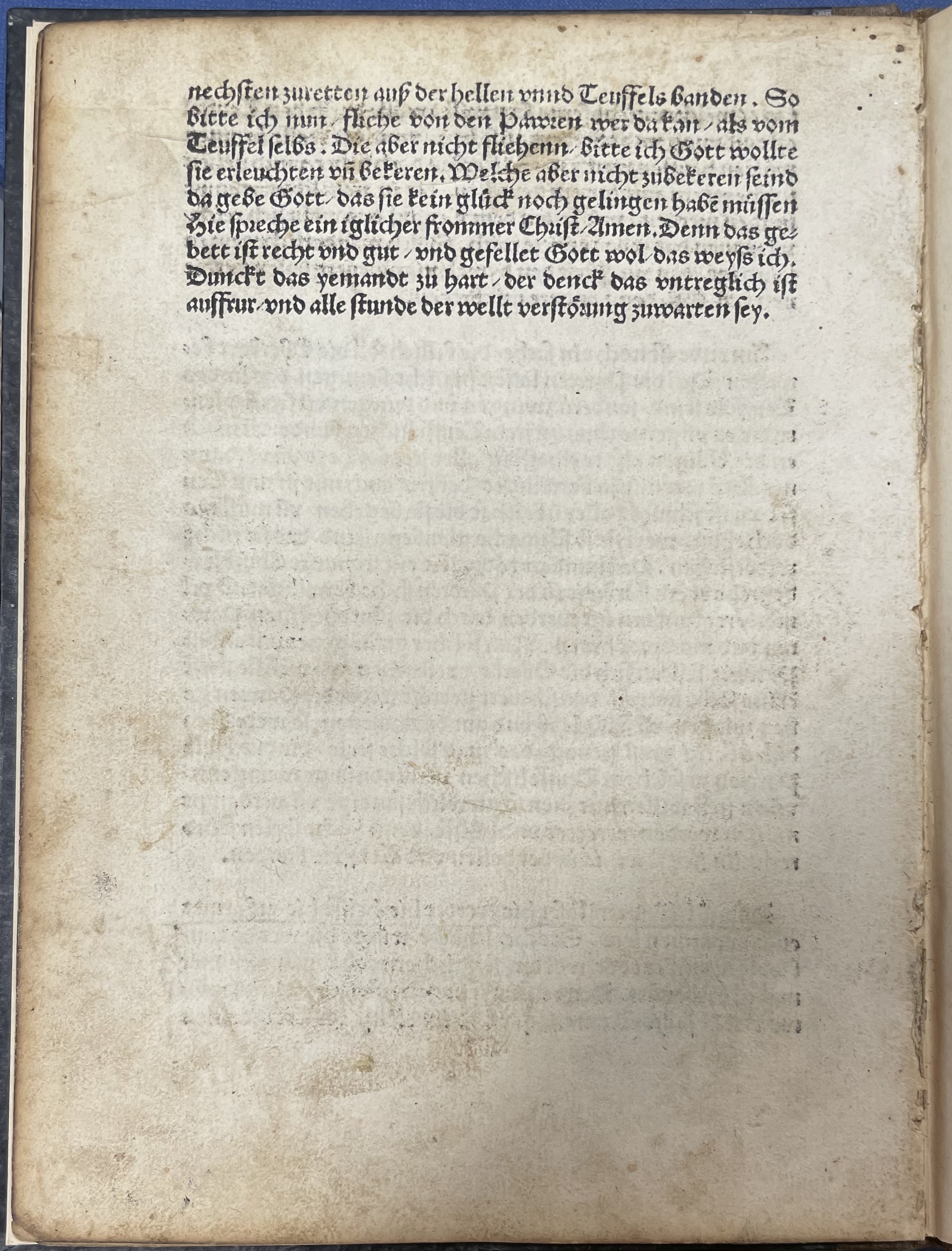 a4vnechsten zuretten auß der hellen vnnd Teuffelsbanden. So bitte ich nun / fliehe von den Pawren wer da kan / als vom Teuffel selbs. Die aber nicht fliehenn / bitte ich Gott wollte sie erleuchten vn̄ bekeren. Welche aber nicht zubekeren seind da gebe Gott / das sie kein gluͤck noch gelingen habē muͤssen Hie spreche** 3 ps subjunctive ‚sprechen‘. ein iglicher frommer** ENHG ‚frum‘ in a broader sense, more like MHG ‚vrum‘ than NHG ‚fromm‘. Christ / Amen. Denn das gebett ist recht vnd gut / vnd gefellet Gott wol / das weyss ich. Dunckt das yemandt zu hart / der denck das vntreglich ist auffrur / vnd alle stunde der wellt verstoͤrung zuwarten sey.